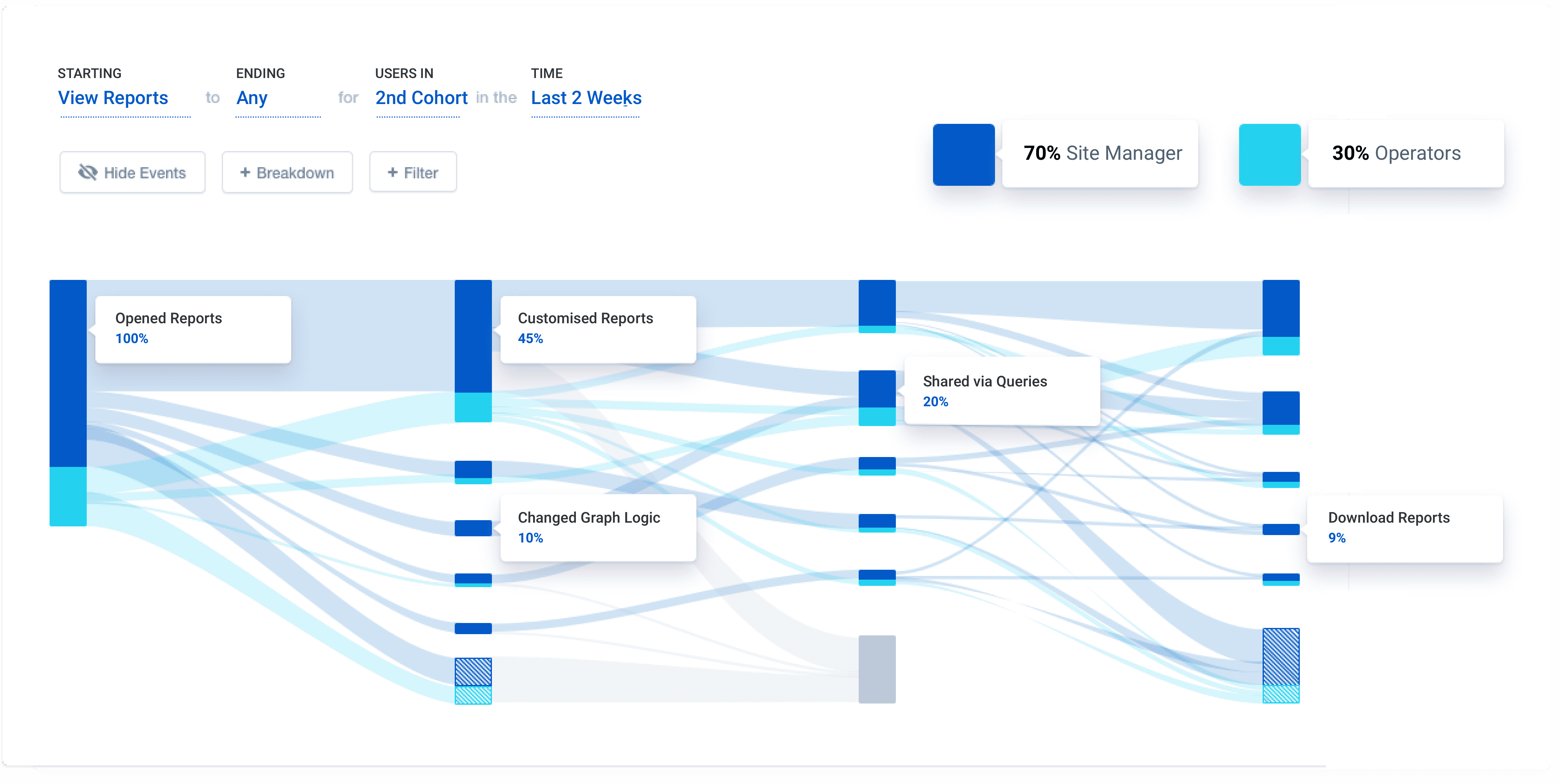 User flow analysis revealed that while 100% of users accessed reports, only 10% engaged with advanced graph logic controls. This indicated a gap between flexibility and perceived need, leading us to simplify advanced controls for most users and surface guided presets instead.