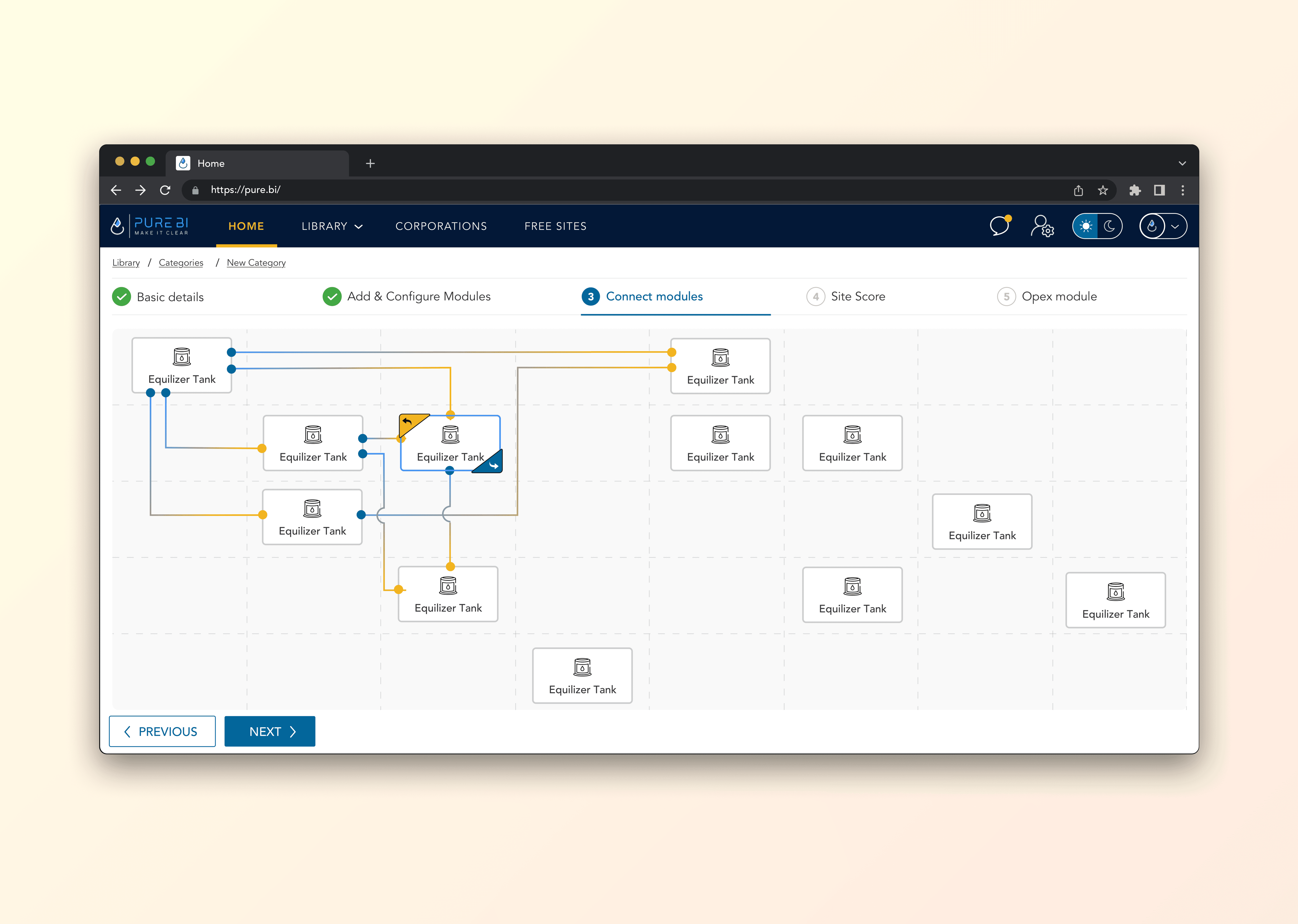 We designed a visual plant setup environment where Site Managers could either select from pre-built plant templates or create a custom structure from scratch. Using a drag-and-drop interface, they could add equipment modules, configure them, and visually link them to represent how water flows across systems. This allowed managers to mirror their physical plant layout in a way that felt familiar and intuitive.